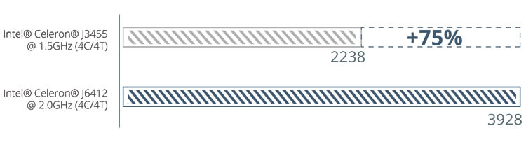 - базовый, вычислительный, четырехъядерный процессор Intel Celeron J6412 и встроенная оперативной память LPDDR4X емкостью 8 ГБ. Данный дуэт обеспечивает высокий уровень производительности и графических возможностей, при минимальном энергопотреблении. Производительность выросла практически в 2 раза (на 75% в CPU benchmark) по сравнению с предыдущим поколением на базе Intel Celeron J3455
