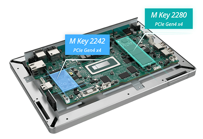 AFL4-ADLP имеет два слота M.2 M-key, совместимых с интерфейсом PCIe, что позволяет устанавливать высокоскоростные SSD-накопители. Благодаря интерфейсам PCIe x4 с возможной скоростью до 64 Гбит/с, эта характеристика обеспечивает увеличенную гибкость и эффективность работы панельного ПК.